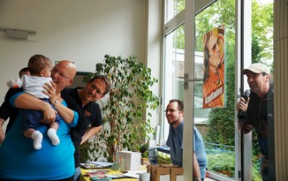In der Zwischenzeit waren auch die Ehrengäste des Tages angekommen: Zur großen Freude der Fans konnten neben dem Geburtstagskind Guildo auch alle Strümpfe sowie Prinzessin Stephanie und Timo Tei beim Fantreffen dabei sein. Zum Ende unserer Versammlung richtete sich die Aufmerksamkeit der Mitglieder dann auf die Terrasse des Forums. Guildo und Schrader begutachteten schon mal ihr Arbeitsgerät – den großen Grill. Vielleicht auch nichtsahnend, dass es in diesem Moment ein großes Hallo im Saal gab, als die Beiden entdeckt wurden. Und so baten wir Guildo zur Begrüßung der Fans ins Forum einzutreten. Ihm erschien dabei der Weg durch das Fenster als die schnellste Variante. Quasi noch im Fenster stehend wurde zunächst unser jüngstes Mitglied Ben mit einer kleinen Gesangseinlage ganz besonders herzlich willkommen geheißen. Nach ein paar Begrüßungsworte von Guildo und einem kurzen „Hallo" von Schrader (auch im Fenster stehend), wurden alle noch auf den weiteren Programmverlauf eingestimmt. Da vielen schon der Magen knurrte, galt es keine Zeit mehr zu verlieren, die Grillmeister endlich ans Werk zu lassen.