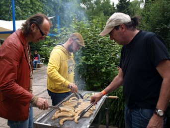 Gegen Mittag schaute auch Guildos Managerin Silke samt Grillgut, welches Guildo uns zum Fantreffen spendierte, bei uns vorbei. Dank der vielen Helfer waren wir mit den Vorbereitungen schnell fertig und so machten sich die Meisten auf den Weg zum Konzert am Tanzbrunnen in Deutz. Ich blieb mit Sascha und unserem jüngsten Fanclubmitglied Ben im Forum, um die anstehende Mitgliederversammlung und Neuwahl des Vorstandes vorzubereiten. Wir nutzten auch die Zeit, um schon mal den Grill anzuschmeißen, damit der „Grillmeister" nach seiner Ankunft direkt loslegen kann. Denn Guildo äußerte kurz vor dem Fantreffen den Wunsch auch selbst grillen zu wollen. Dazu aber gleich mehr. Weil sich der Konzertbeginn nach hinten verschob, wurden wir zwischendurch über Handy informiert, dass sich der anvisierte Beginn der Mitgliederversammlung wohl nach hinten verschieben würde.